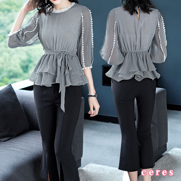 【製品仕様】■商品名セットアップ レディース 夏 半袖 ギンガムチェック トップス フリル シフォン きれいめ オシャレ 通勤 オフィス パンツスタイル クロップドパンツ ストレッチパンツ ペプラム ビジネス 足長 美脚 S M L 2L XL LL ■商品説明パンツスタイルの涼しげなセットアップ。裾に向けて広がる、センターライン入りのパンツで足長美脚効果あり。■サイズ/寸法S M L 2L■素材/材質トップス:ポリエステル100%ボトムス:ポリエステル98% ポリウレタン2%■色/カラーONE COLOR