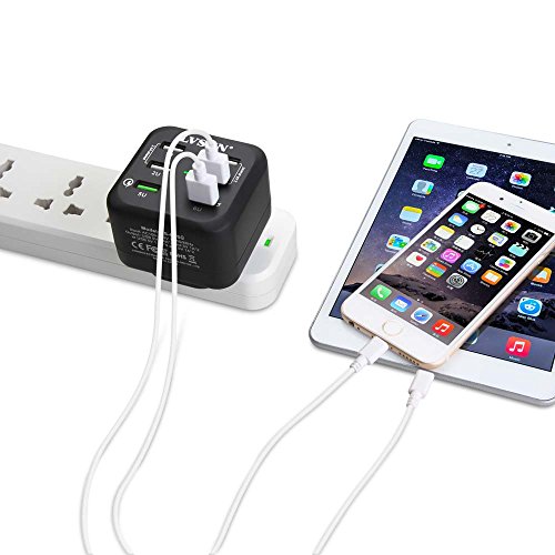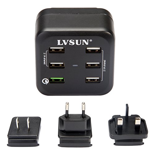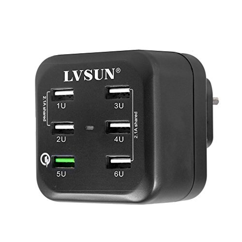 Udoli 6-Port USB Wall Charger Quick Charge 2.0 with US, EU, UK Interchangeable AC Plugs for Galaxy S7/S6/Edge/Plus, Note 4/5, HTC One M8/M9, iPhone 6, iPad Mini and More – Black