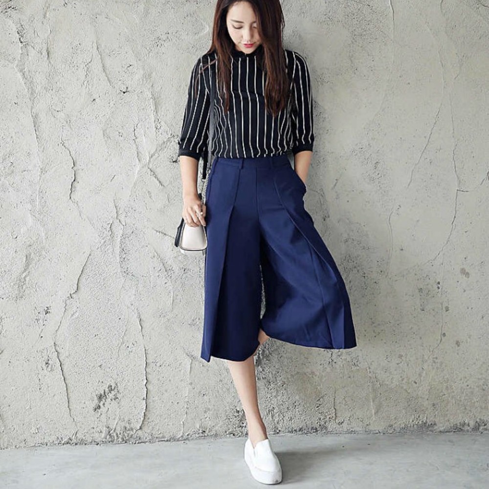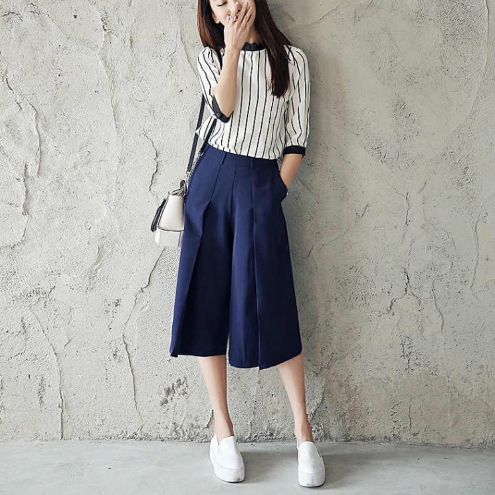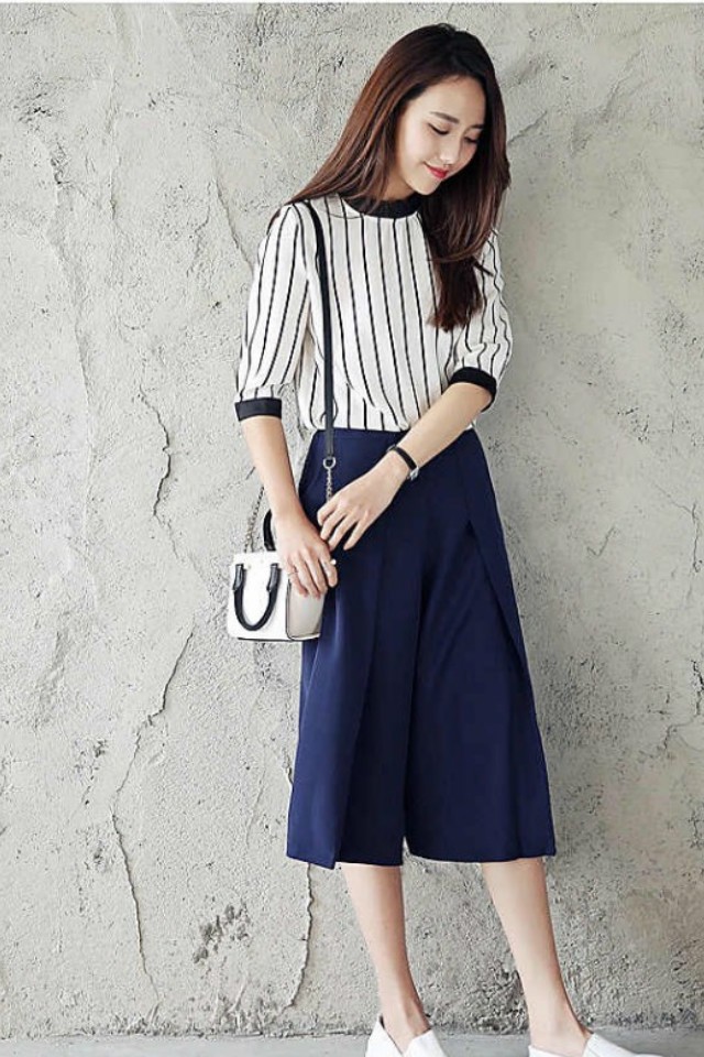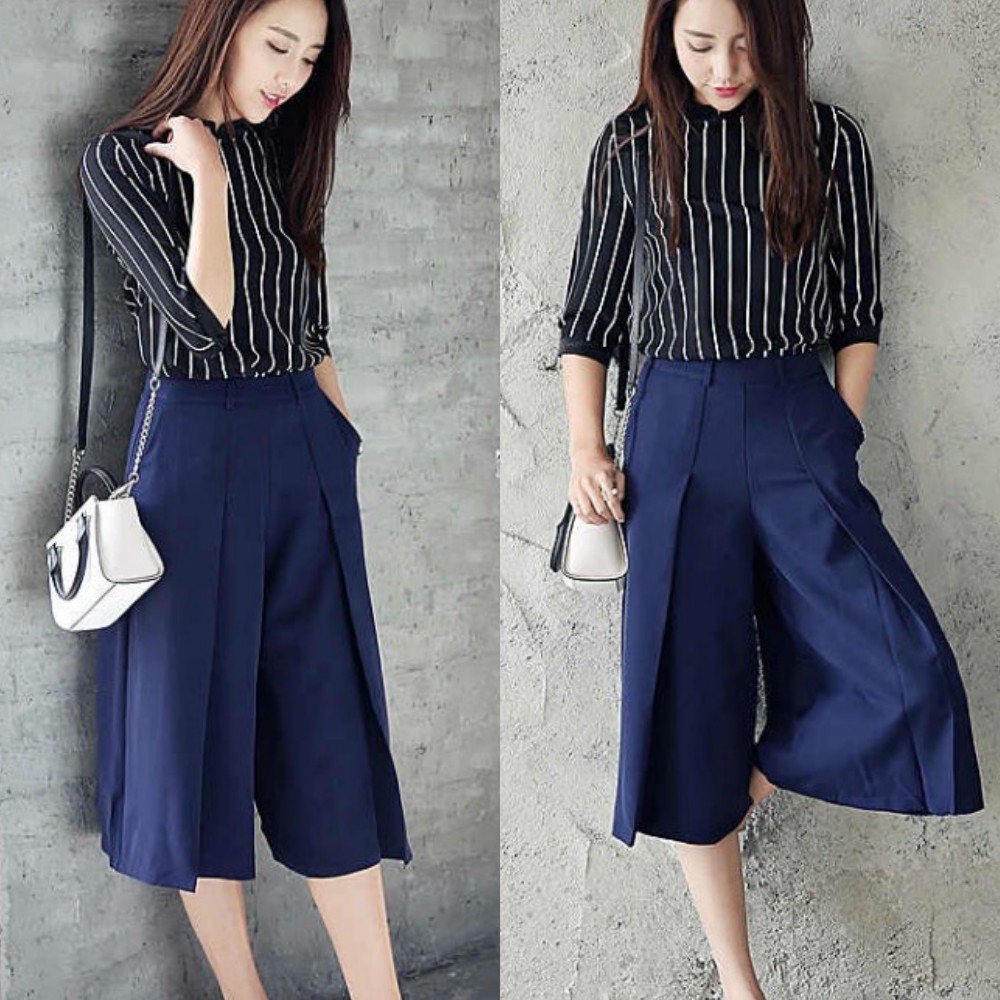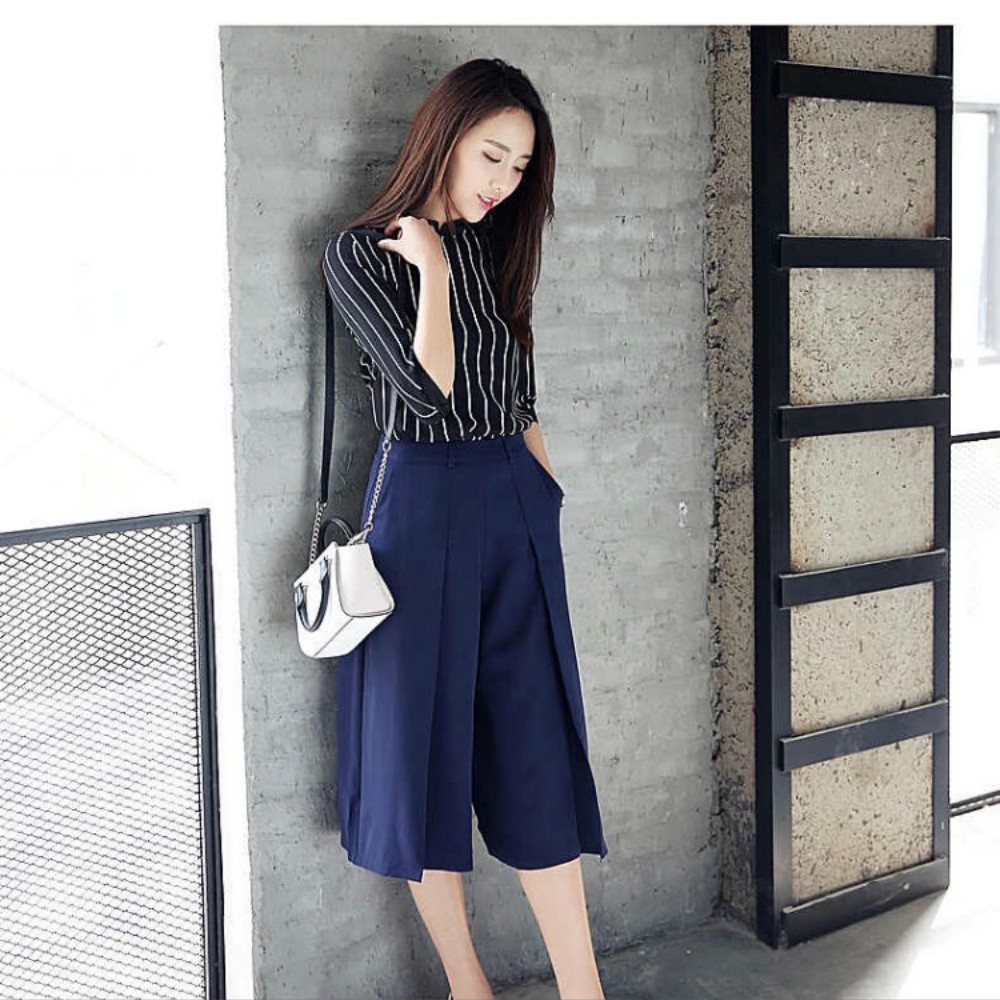 セットアップ★ストライプ柄 シャツ半袖 トップス&ガウチョパンツ カジュアルスーツ