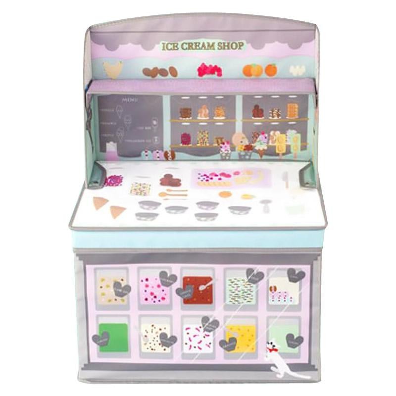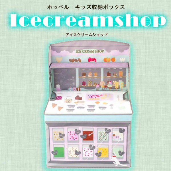インテリアと教育を併せもったキッズ収納アイテム。蓋をあけると中身は大容量の収納ボックスになっていて、おもちゃなどを片づけることができます。おしゃれに飾れて、「ごっご遊び」でお子さんの社会性を高めるアイテムとしてもご利用いただけます。アイスクリームショップをイメージしたデザインで子供ごころをくすぐります♪ |