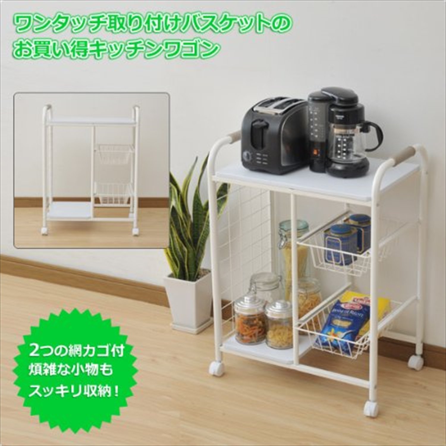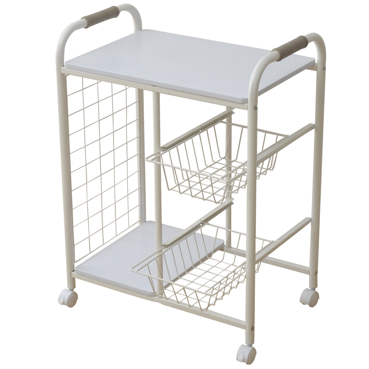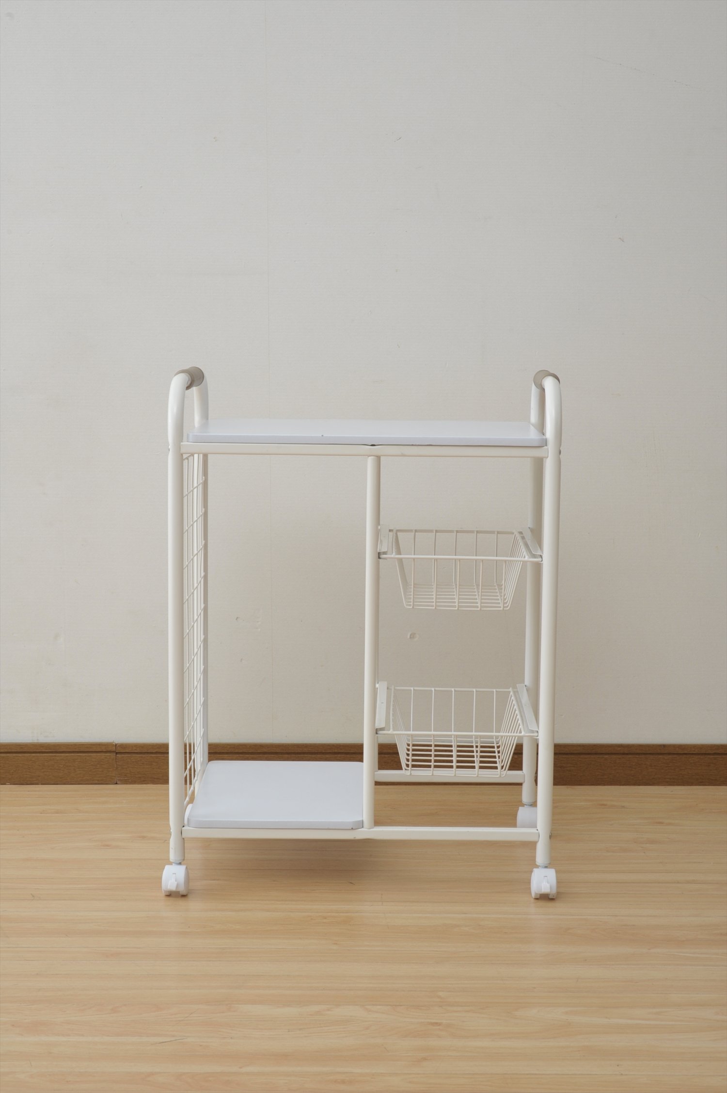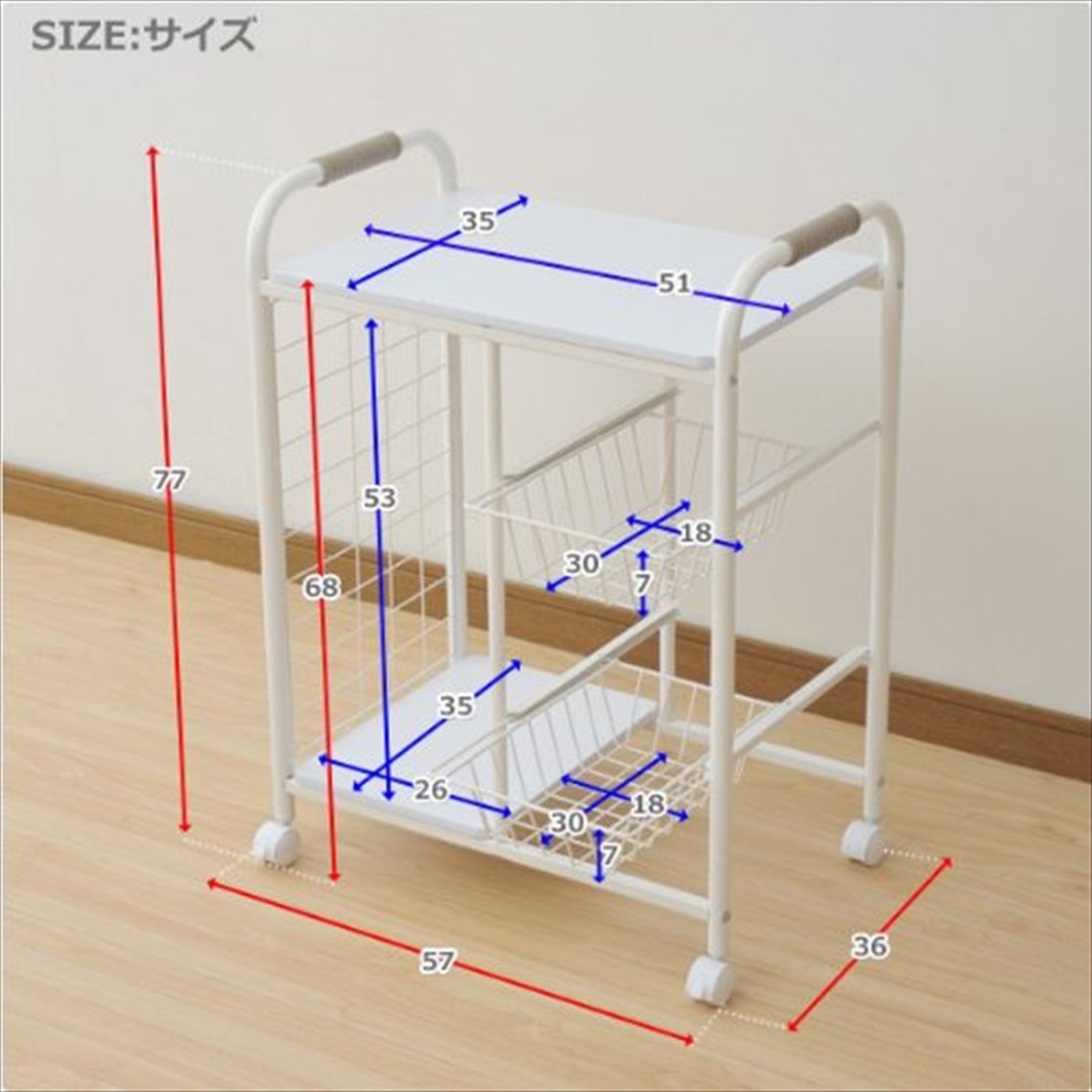 ● Complete product ● Convenient kitchen wagon with net basket ● Convenient for storage of seasonings and dry matter ● Top plate size: Width 51 Length 35 cm ● Lower shelf size: Width 26 Length 35 Height 53 cm ● Basket size: Width 18