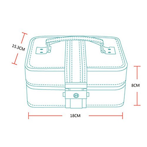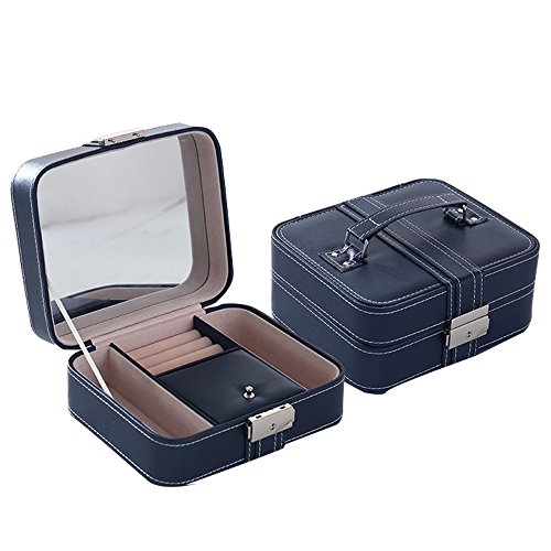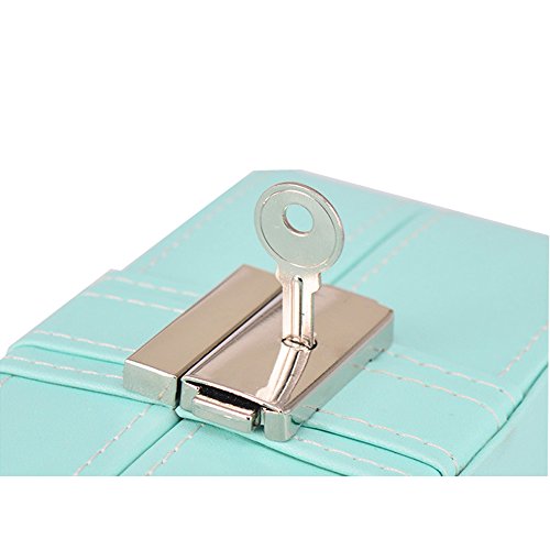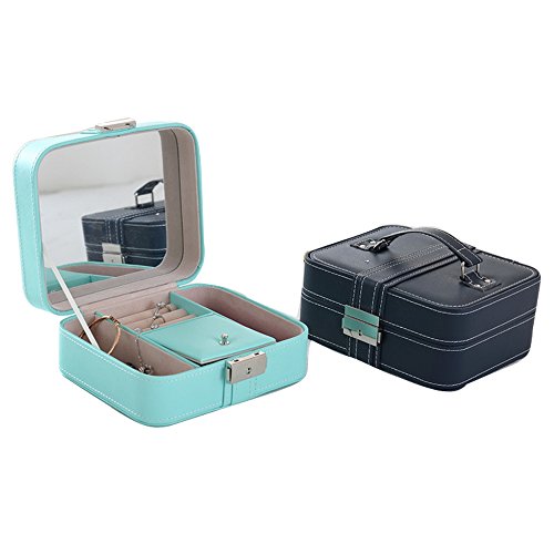 -. Feature : The Best Travel Jewelry Box: The combination of large mirror inside for makeup and dress, the lock to protect your jewelries, the compact size and the comfortable handle makes this one be the best travel jewelry box ever / Practical Inner 4-Component: One hidden storage space in the middle with lid cover, 4 slots for rings storage; 2 large division in the side for keep large jewelries and other small cosmetic like lipstick or anything else you'd like to / Durable Material: High quality colorful PU leather and soft velvet inside, providing best protection for your jewelries / Compact Size: Measured 180mm length and 153mm width and 80mm height / Best gift choice for girls and ladies, lovely tiffany-blue and elegant purplish blue