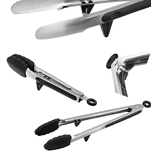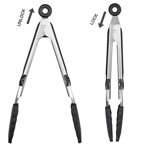EASY TO CLEAN UP AND STORE--Built-in stand design prevents the threat of contamination and keeps your countertop clean. Pull-Ring on the end locks the tongs together easily for storage. Dishwasher safe.