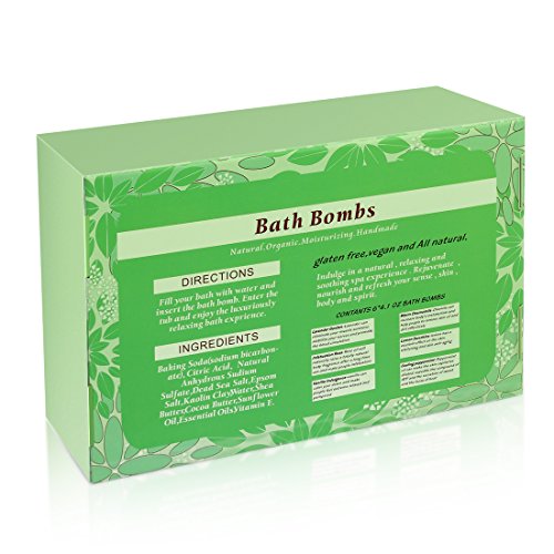 -. Feature : 6 Larges ball size 4.1 oz each! Not 2.5 oz like a majority of the bath bombs on Amazon.A green bath glove inside for free! / Each bath bomb with individually wrapped.Also the high quality packaging will keep the bath bomb fresh. / These bath bombs infused with premium ingredient such as Shea & Coco Butter,sea salt and Organic Essential Oils / Perfect for birthday gift,Christmas day,spa/bath gifts,for the special one, perfect gifts for mom, wife, girlfriend or women you love / Bath Bombs will dissolve releasing gentle bubbles of citric acid and deep moisturizers come together to bring you a professional quality spa treatment in the comfort of your own tub
