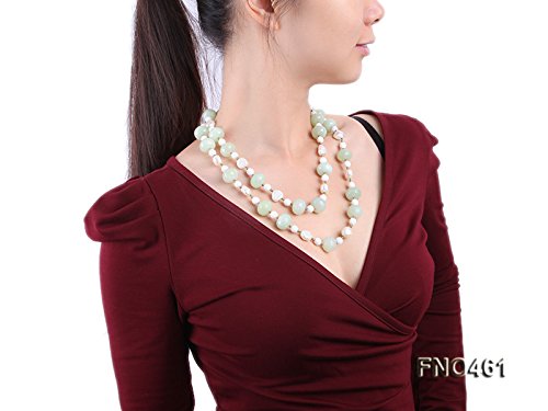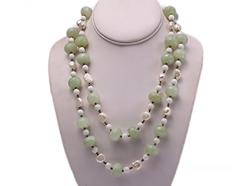 Description *This unique style necklace mainly consists of faceted wheel-shaped aventurine beads, white faceted 8mm porcelain beads, and white 11x13mm Baroque pearl beads.