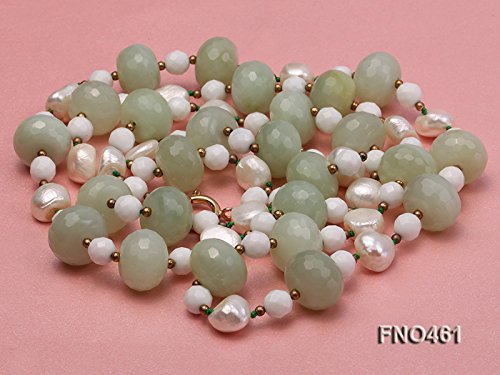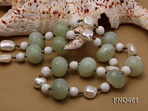 This unique style necklace mainly consists of faceted wheel-shaped aventurine beads, white faceted 8mm porcelain beads, and white 11x13mm Baroque pearl beads.