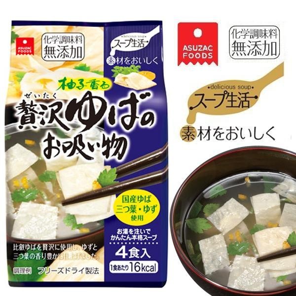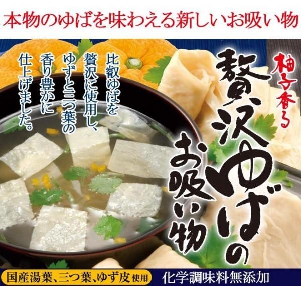 | 原材料 | ゆば、醤油、魚介エキス、砂糖、三つ葉、食塩、澱粉、デキストリン、酵母エキス、かつおだし、醸造調味料、ゆず果汁、ゆず皮、小麦グルテン酵素分解物、オニオンエキス、植物油脂、酸化防止剤(V.E.) |