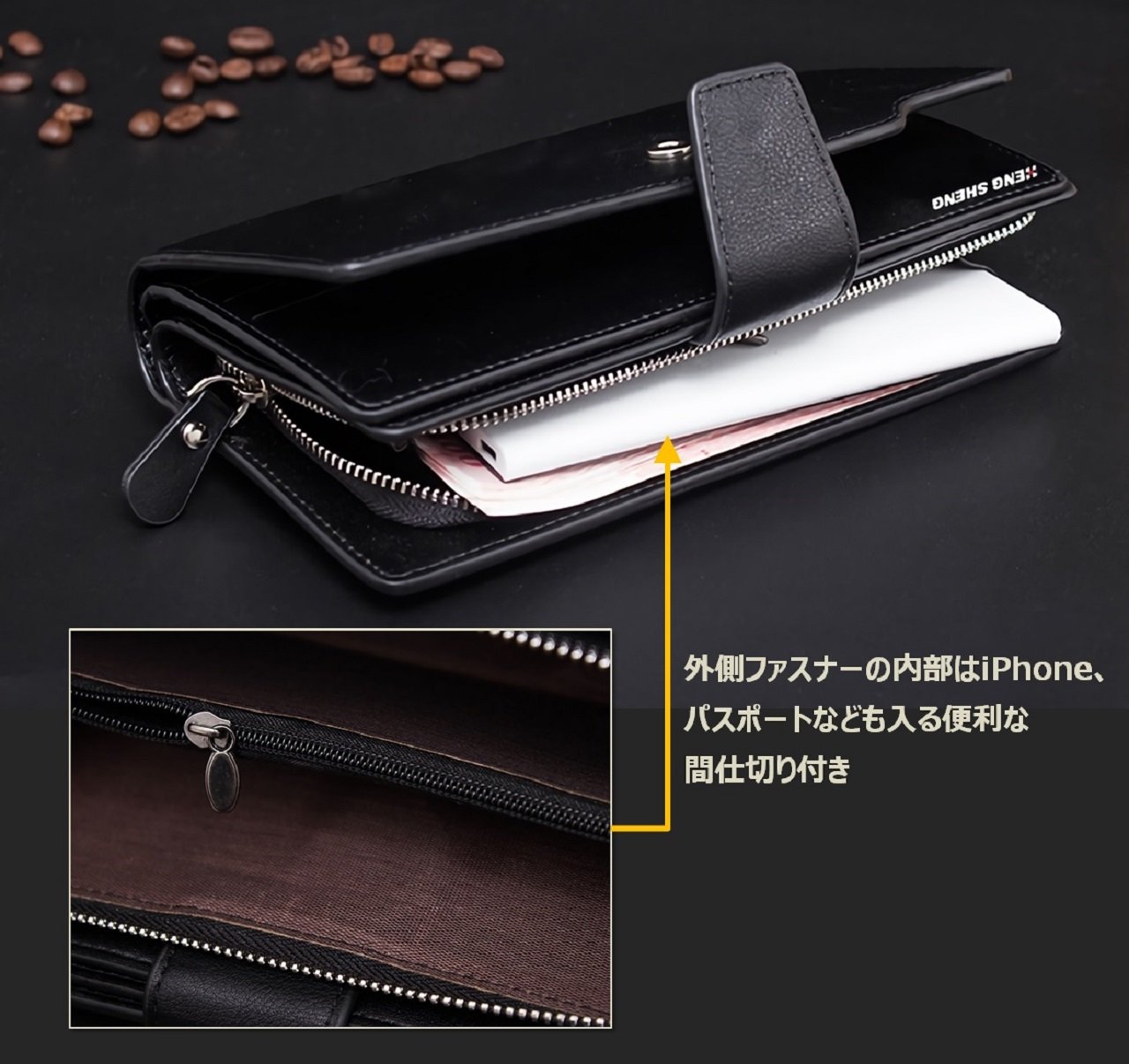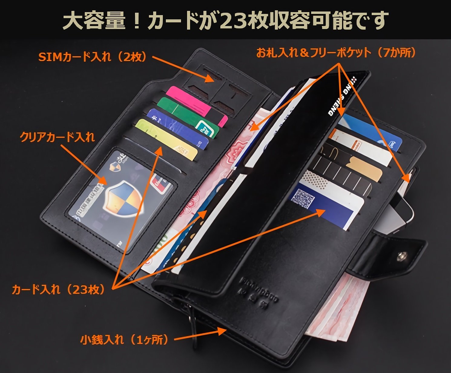 【Specification】 Card insert: 23 pieces Transparent card holder: 2 places Wallet: 2 places Other free pocket (bill size): 5 places Pickup: 1 place SIM card holder: 2 places with strap L-shaped fastener