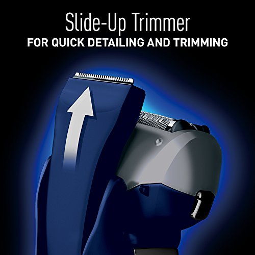 Ergonomic, sure-grip rubberized handle enhances control; slide-up 45 Degree electric razor trimmer adds the perfect finish to beards, mustaches and sideburns.
