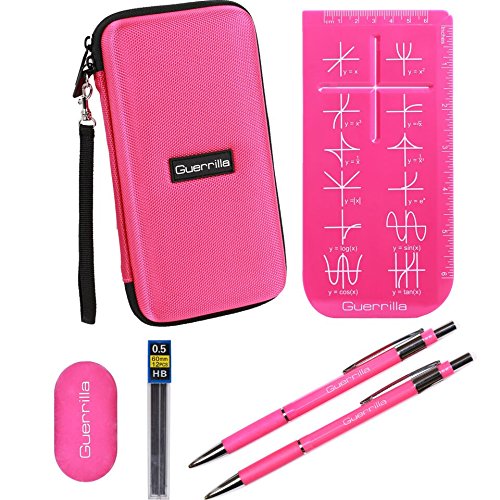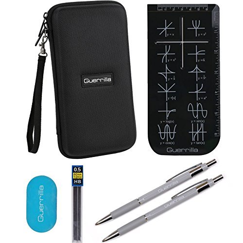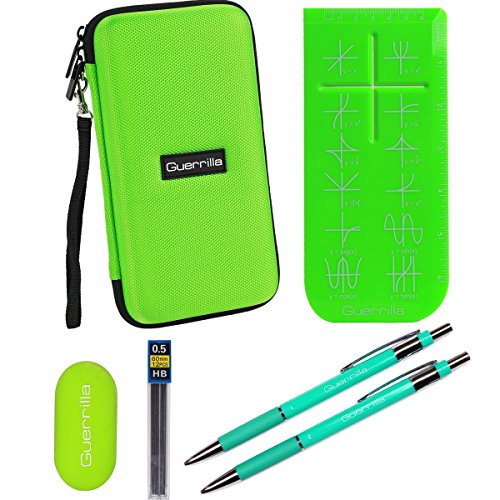 The Guerrilla calculator zipper case is the perfect carry case for any graphing calculator. It's strong, durable, anti-shock, weatherproof EVA material will protect your calculator along with its accessories. The removable wrist strap allows for more convenient carrying. Some of the calculators that the case will fit are: TI-83, TI-84,TI-84 color, ti-89, ti-nspire, HP, casio etc. This case will also fit the Guerrilla protective silicone case or the Guerrilla hard slide case. The case comes along with 2 Guerrilla mechanical pencils, Guerrilla eraser, lead refill, and Guerrilla graphing ruler. The dimensions of the case are: outer- 8.3" L x 4.3" W x 2.2" H. Inner bottom- 8" L x 4" W x 1" H. Inner lid- 8" L x 4" W x 0.7" H.Feature