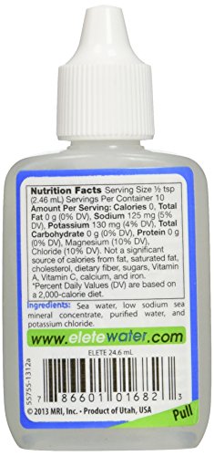 Clinically tested to improve hydration, elete is all-natural, lightweight, effective and versatile. Less than an ounce makes 2.5 gallons of electrolyte water. Fuel hydration, endurance and proper muscle function with each sip you take. Elete contains no sugars, carbs, flavorings, or anything artificial. Provides balanced ions of potassium, magnesium, sodium and chloride. Elete is totally compatible with hydration packs and when added to water tastes like water. It will not leave a film or residue behind to clean up. Pocket bottle makes ten 32 ounce. servings of electrolyte water.Feature