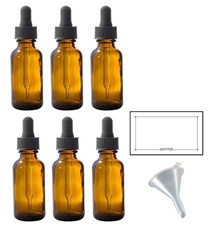 1 oz Amber Glass Boston Round Dropper Bottle (6 pack) + Funnel and Labels for essential oils, aromatherapy, e-liquid, food grade, bpa free