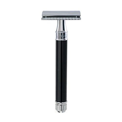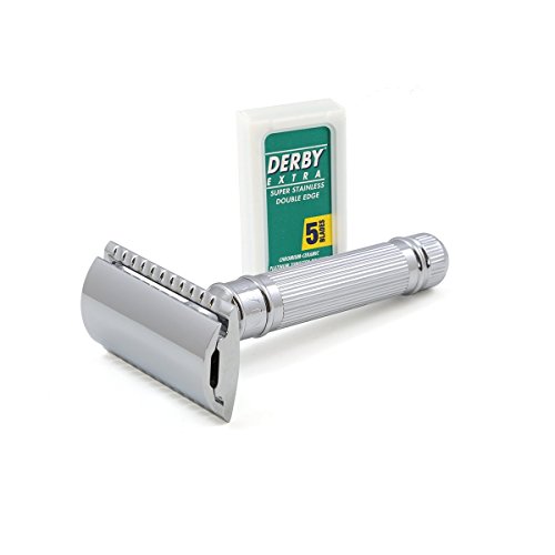 This fabulous traditional double edge safety razor is fitted with the latest precision manufactured Edwin Jagger DE razor blade head creating great interest among experienced wet shavers requiring a close and accurate wet shave with finished results comparable to the original straight cut throat razor. The classic closed comb head, expertly engineered caps the highly polished chrome plated solid brass tubular handle with the Edwin Jagger name embossed around the collar. Traditional lined pattern detail enhance this well balanced Edwin Jagger traditional double edge safety razor perfectly performing very close shave results and reducing ingrowing hairs. Each DE razor is supplied with 5 Derby safety blades so the razor is shave ready.Feature