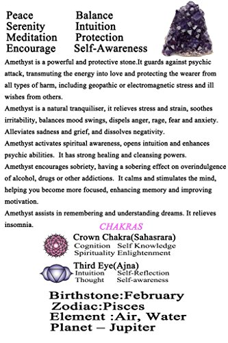 Amethyst is a powerful and protective stone. It guards against psychic attack, transmuting the energy into love and protecting the wearer from all types of harm, including geopathic or electromagnetic stress and ill wishes from others.