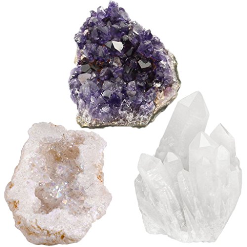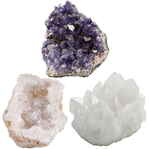 Size approx: Brazil Amethyst Cluster: 2.5-3.5 Inches/Clear Quartz Cluster: 1.2*2.15inches-2.1*3.4inches/Quartz Geode: 2.36-3.55 Inches Weight approx: 1lb(total) 3 specimens which adds up to 1lb