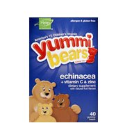 Yummi Bears Echinacea Plus Vitamin C and Zinc Gummy - 40 per pack -- 3 packs per case. Description Dietary Supplement Natural Fruit Flavors Americas #1 Childrens Vitamin Allergen & gluten free Complete Nutritional System Its not a surprise that childrens immune systems sometimes need a boost to keep their growing bodies strong and healthy. Great News! Yummi Bears are the perfect solution, because kids love the tasty fun and moms and dads appreciate the wholesome nutrition. Yummi Bears Echinacea + Vitamin C & Zinc naturally supports and nourishes your childs immune system. This unique blend of nutrients contains the perfect amount of herbs and vitamins to boost childrens defenses and keep them healthy all year round. Your friends at Hero are committed to delivering the highest quality, all-natural vitamins and minerals that help your kids get the nutrition they need every day. Other Ingredients Glucose syrup, natural cane juice, gelatin, citric acid, lactic acid, natural colors added (including black carrot, annatto, and turmeric), natural flavors, fractionated coconut oil and carnauba wax to help prevent sticking. Free of: Yeast, Wheat, Milk, Eggs, Soy, Gluten, Salt, Peanuts, Shellfish, Artificial Colors, Artificial Flavors, Salicylates and Preservatives. Warnings Product appearance may change over time due to natural color. This does not alter potency of the product. Although our products are manufactured in an allergen-free environment, federal law requires that we state that this facility also produces products that contain peanuts. Store in a cool, dry place, out of the reach of children. Do not use if safety seal is broken. Keep sealed for freshness. Shelf Life: 730 days