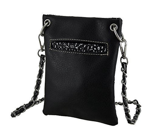-. Feature : 8 in. High, 6 in. Long / Textured Vinyl Construction and Trim/Polyester Lined / Embroidered Sugar Skull and Floral Accents / Removable 1/4 in. Wide Chain Strap w/26 in. Drop / 1 Slip Pocket Inside and 1 On the Back