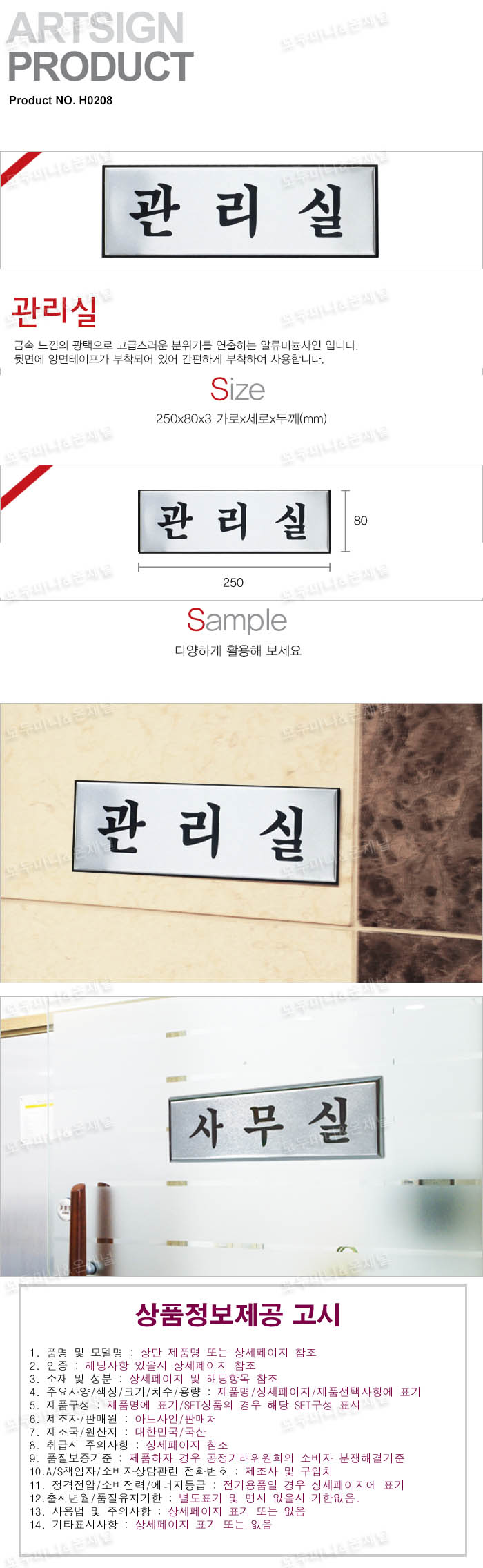 - 품명 및 모델명관리실 알루미늄표지판(250x80mm)