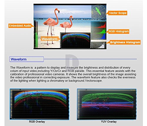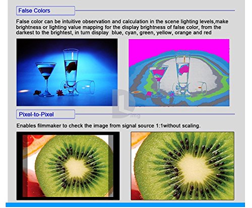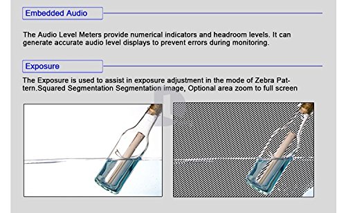 - Feature : Resolution: 1280×800 Pixels; Brightness: 400cd/m2; Contrast: 800:1; Aspect Ratio: 16:10; Backlight: LED. / Viewing Angle: 89°/89°(L/R), 89°/89°(U/D). Inputs: 3G/HD/SD-SDI×2, HDMI, Ypbpr, Video, L/R. / Seamless Switch without interruption, Peaking Filter in Red(Focus Assist), obtaining the sharpest possible picture. / False Color filter, get proper exposure to be achieved without the use of costly, complicated external test equipment. / Zebra Exposure, Image Flip, Zoom-in, Squared Segmentation, Check Field (Red,Green,Blue,Mono) and more Attractive Features as Below.