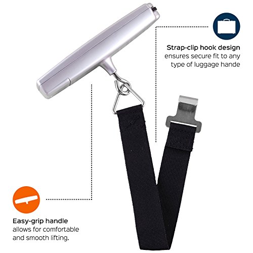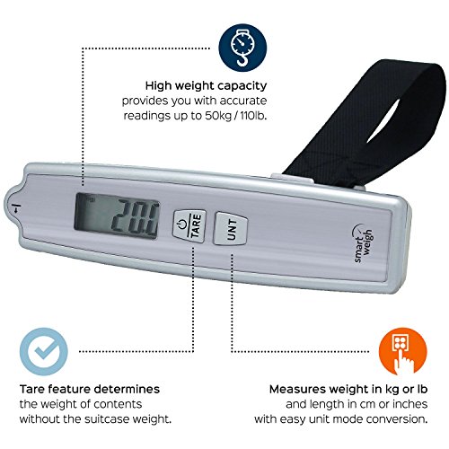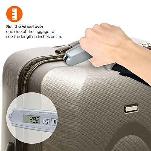 - Feature : NEW TECHNOLOGY: Measure all dimensions of luggage with the new built it electronic ruler. Get a digital length measurement by simply rolling the ruler wheel along the object, readings will instantly be displayed in either centimeter or inches / BUILT TO LAST: Carefully crafted to be strong and durable with a stainless steel plate and heavy duty strap to ensure lock and fit on any luggage handle. Strap can also convert luggage scale into a hanging scale / HIGH PRECISION: Advanced sensors give accurate and consistent readings up to 50kg/110lbs or 300cm/118in. Switching between lbs/kg or in/cm is done by simply pressing the Unit button / DESIGNED FOR THE TRAVELER: Luggage scale is lightweight and portable. Travel with this scale and never pay baggage fees again! / FEATURES: Large LCD display, low battery indicator, tare function and maximum capacity warning. Baggage scale ships with batteries and two year warranty