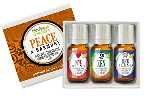 -. Feature : All Healing Solutions sets come beautifully packaged as shown in the listing pictures and make a fantastic gift for any occasion. / The Peace & Harmony Blends Set includes the following oils: Love, Hope, and Peace / The most UNIQUE and AMAZING SMELLING essential oils on the market, in our opinion. If you are not ABSOLUTELY amazed, receive a full refund from the manufacturer, Healing Solutions no questions asked! / PURE + RIGOROUS QUALITY TESTING & CONTROLS: Distillation facility is GMP, ISO 9001 and Kosher certified, FDA Registered. Make sure ALL oils you buy have these qualifications. In our opinion this oil is superior to organic and THE MOST RARE, BEST SMELLING, AND MOST THERAPEUTICALLY EFFECTIVE ESSENTIAL OILS / Healing Solutions is SUPERIOR because it offers over 170 different oils for blending/pairing including: Adoration Blend Agar Agarwood Ajowan Ajwain Allspice Ambrette Amyris Angelica Root Anise Star Aniseed Anti-Aging Aphrodisiac Balance Balsam Basil Bay Bergamot Betel Leaf Birch Black Pepper Blood Orange Breathe Cade Cajeput Calamus Root Calming Camphor Cananga Caraway Carrot Cassia Cedarwood Celery Seed Chamomile (German & Roman) Chili Seed Cinnamon Bark Cinnamon Leaf Citronella Fresh Citrus Bliss Clary Sage Cleaning Clove Coffee Copaiba Coriander Costmary Cumin Costus Cranberry Cypress CyP.R.Ioli Cubeb Curry Davana Deep Muscle Relief Dill Weed Dragon Rest Earth Wood Elemi Eucalyptus Elecampane Exhale Fennel Fenugreek Fir Needle Frangipani Frankincense French Lavender Galangal Garlic Geranium (Egypt) Ginger Gingergrass Good Night Goldenrod Grapefruit Guaiacwood Harmony Head Ease Helichrysum Hickory nut Ho Wood Hope Horseradish Hydacheim Hyssop Idaho Invigorate Jamarosa Jasmine Absolute Joy Juniper Berry Key Lime Labdanum Ledum Lemon Lemon Linaloe Eucalyptus Lemon Myrtle Lemongrass Love Mace Mandarin Meditation Melaleuca See Melissa Mentha Mountain Mugwort Mustard Orris Myrrh Myrtle Neroli Niaouli Nutmeg Onion Oregano Palmarosa Palo Santo PaP.R.Ika Oleoresin Palo Patchouli Peace Penny Royal Perilla Peppermint (like NOW foods) Peru Balsam Pest Shield Petitgrain Pimento Pine Pink Lotus Premium Thieves Protective (like Doterra & Young Living Purification) Ravensara Red Relaxation Renew Restoration Bulgarian Moroccan Rose Geranium Rosemary Rosehip Rosewood Sage Sandalwood Sensation Spearmint Spikenard Spruce Stay Alert Stress Relief (like Eden's Garden Plant Therapy & Guru) Styrax Benzoin (like Deep Blue OnGuard Diffuser) Sweet Ambiance Sweet Marjoram Sweet Orange Tangerine Tansy Thuja Thyme Tonka Bean Tree Tea Turmeric Valerian Vanilla Vetiver Wintergreen Zedoary and Ylang