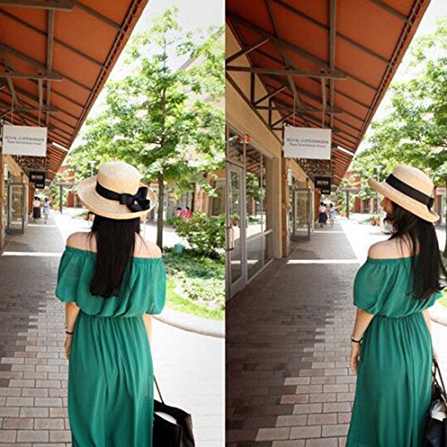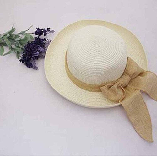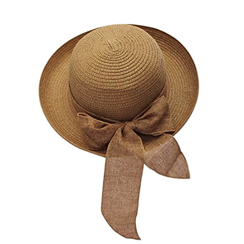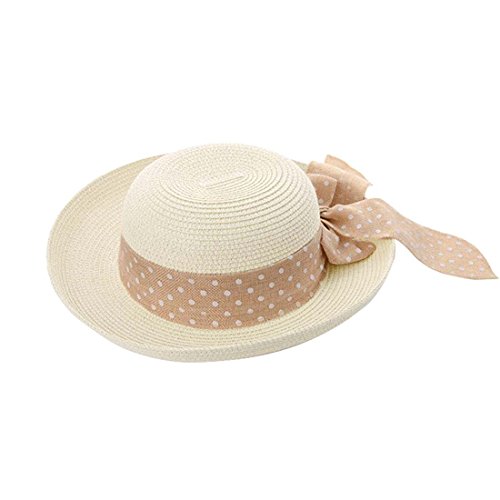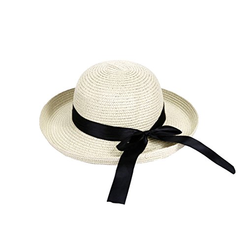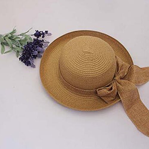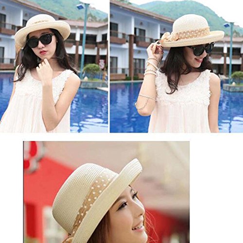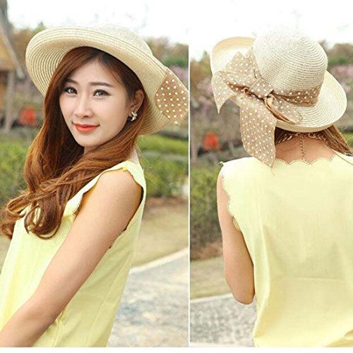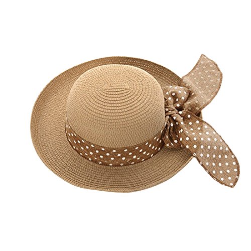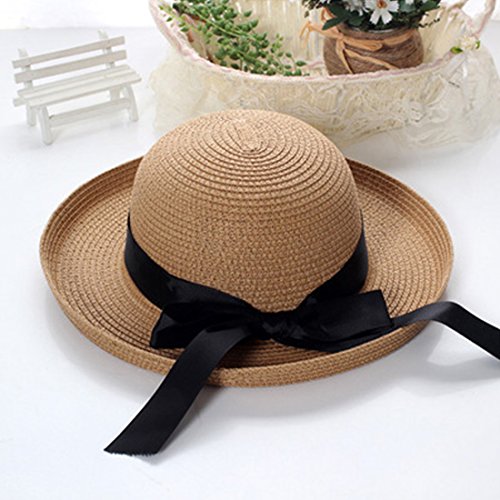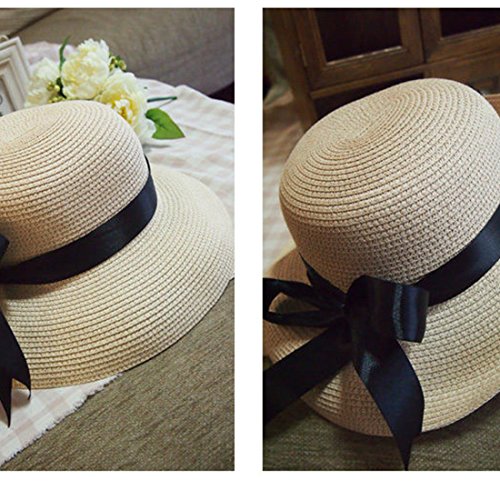 | Women's Summer Casual Dot Bowknot Sun Straw Hat Black Ribbon and Khaki |