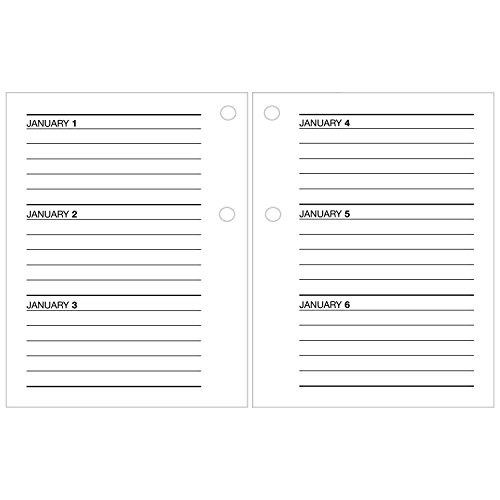 Unruled, two pages per weekday with Saturday and Sunday combined for detailed scheduling and note taking. Past, current and future months reference assists planning and scheduling
