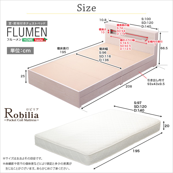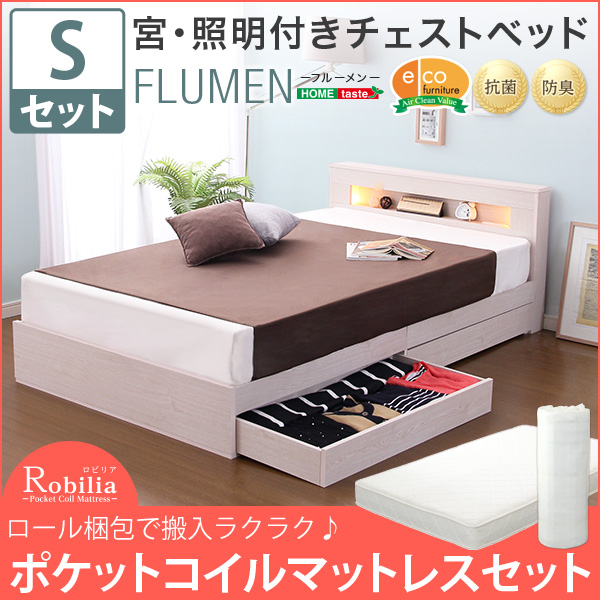 宮、照明付きチェストベッド【フルーメン-FLUMEN-(シングル)】(ロール梱包のポケットコイルスプリングマットレス付き)
