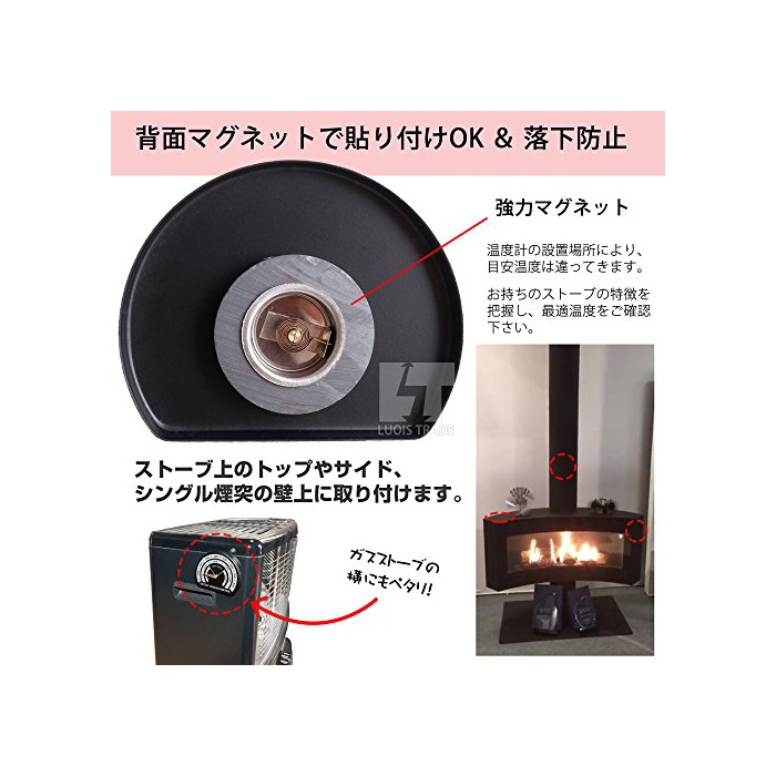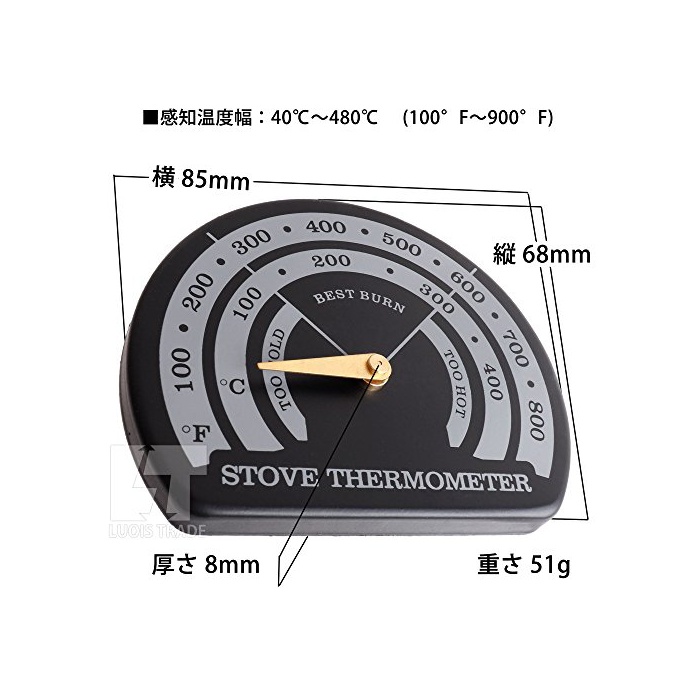 【온도계 스펙】■사이즈:횡85mm 종68mm 두께8mm ■중량:51g ■감지 온도폭:40℃480℃ (100°F900°F) ■설치 장소:스토브상의 톱이나 싸이드,또는 싱글 굴뚝의 벽상등 (이중 굴뚝에서는 적정 온도는 얻어지지 않습니다)
