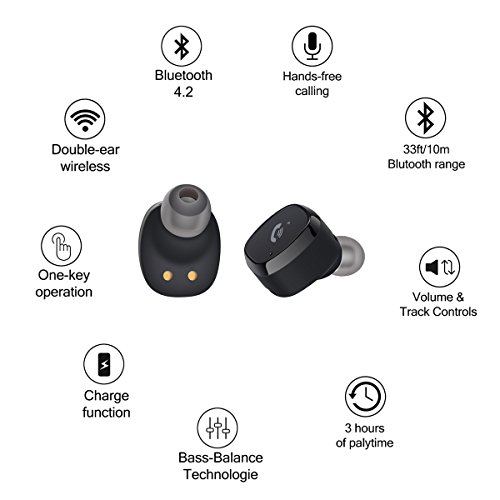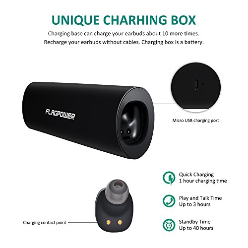 Stereo Earphones: 1.With Noise Echo Cancellation technology, it filters the outside noise to ensure the clear sound quality, makes you enjoy the stereo surround high quality music. 2. Bluetooth 4.2 Version technology gives you stable signal and makes you pair with devices instantly. 3.Two choices when you use them: dual earbuds use and single one(Right) use, use them at the same time, or just use the Right one to save power. 4. Built in Mic, hands free to control Siri: Built in HD and sensitivity microphone idea for car calling, or workout, just press the power button only 2 seconds simultaneously on both earbuds to activate Siri (Please be noted that for safety, the mic is only on the right headset). 5.It is compatible to Most Bluetooth-enable Devices, like iphone 7 plus/7/6s, Samsung Galaxy S6/S5/,computers,windows, laptop and so on Specs Details Bluetooth Chip:(Airoha)AB1526 Bluetooth Version: 4.2 Bluetooth Protocal: A2DP\HFP\HSP\AVRCP\SPP Bluetooth Short Distance: 10 metres Power Bank Capacity:650mAh Headset Battery Power Capacity: 50mAh Headset? Total Standby time :1000h Headset Continuous Call Duration:2.5h Headset Total Call Duration:12h Charge Duration:1h Input Voltage of Power Bank:5V Transmission frequency:20Hz-20KHz What you get 2 x FLAGPOWER Wireless Bluetooth Earbuds [left right] 6 x Ear Caps( L/M/S) 1 x Micro USB Charge Cable 1x 650mAh Charging Box 1 x User Manual 1 x Exquisite and Environmental Protection Gift Box 0 |