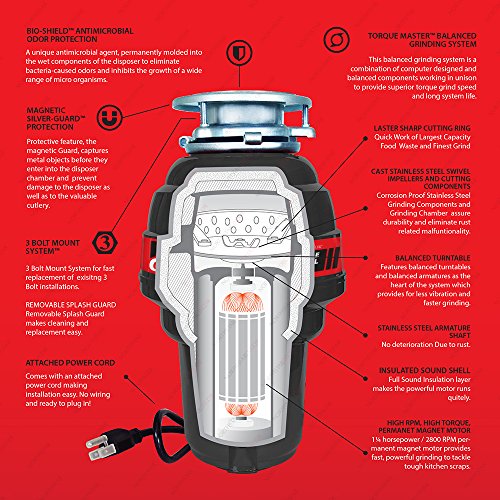 BIO-SHIELD™ ANTIMICROBIAL ODOR PROTECTION - A unique antimicrobial agent, permanently molded into the wet components of the disposer to eliminate bacteria-caused odors and inhibits the growth of a wide range of micro organisms.