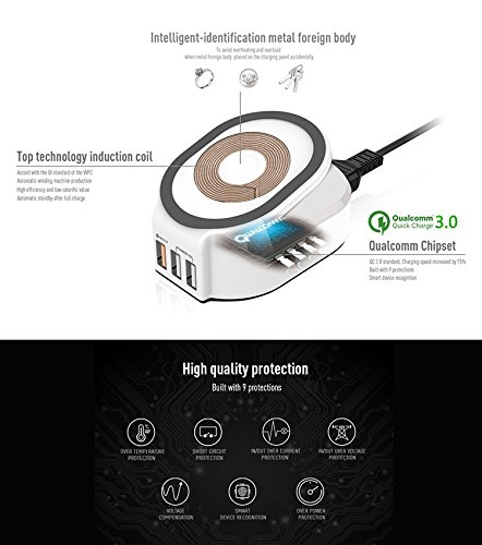 -. Feature : All-in-One Charging Station - Wireless Charge & Qualcomm Quick Charge 3.0 & Power IQ for Common Charging. / Wireless Charging Pad - Simply place your phone with built-in Qi-enabled Device onto the Charging Pad and your phone begins to Charge Automatically. / Smart Identification - Automatically detects the plug-in device supply with the maximum charging current of your devices. / Intelligent Protection - QC, CE, FCC and RoHS certified design ensure superior performance and safety. Over current protection, over voltage protection, short circuit protection and over temperature protection ensure long span life. / Tilted Design - 45-degree design, which allows you to see your phone more easily than if it were lying flat and also allows for Heat Dissipation when it was charging.