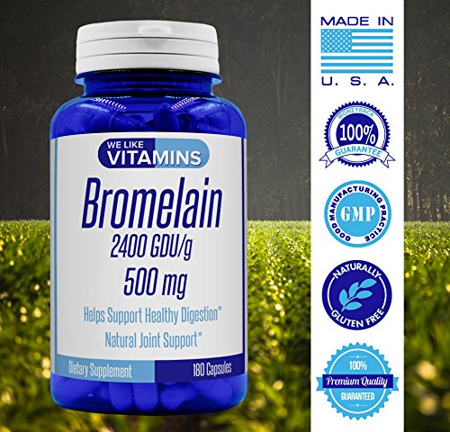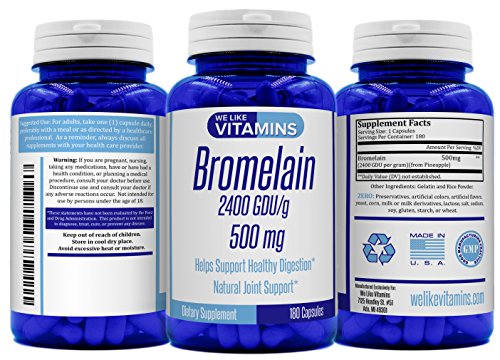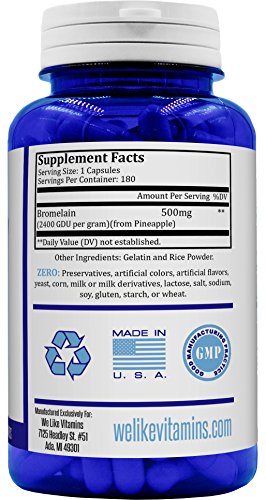 BEST VALUE BROMELAIN ON AMAZON -180 Capsules- 6 MONTH SUPPLY - Each bottle contains 180 Capsules of Pure Bromelain. Others offer fewer capsules or softgels only 60, 90, or 120 at a lower 300mg, 200mg, and 100mg for a higher price. With We Like Vitamins Bromelain you buy fewer bottles and save money.*