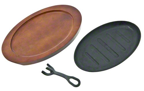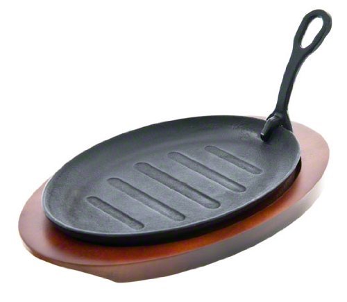 This fajita platter set with wood underliner and gripper. Made of cast iron material. Ready to give those grilled vegetables and meats that appetizing sizzle. Included is a wood underliner, providing a safe placing for the heated platter. Measures 11-inch length by 6-5/8-inch height.