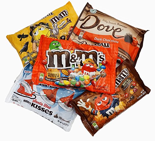 -. Feature : Bundle includes bags of Milk, Dark, Peanut Butter of M&M's or Dove or Kisses. Packaging, flavors, products can be slightly different from the photo. The weight for a bag can vary from 8.87oz to 18.40oz / Christmas, Easter, Halloween, Valentine's Day or others seasons bags can be represented. / Great for kids for Birthdays, Valentines gifts or grown ups, this is the perfect bridal shower candy buffet, is complementary to a tea party. / Care pack for college student chocolate lover, military, camp, back to school, road trips and gift basket stuffers for Halloween, Easter Mother's day, Christmas, Holidays or a wedding party snack table / This is not a manufacturer created bundle. Every item is individually wrapped in individual manufacturer's packaging. Based on supply, each mix will vary slighty as compared to photo.