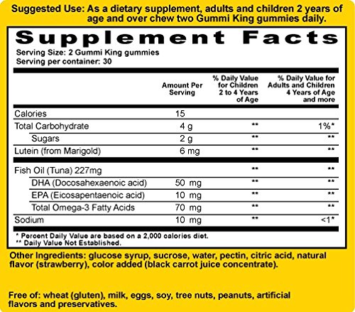 Gummi King Lutein gummies come in natural fruit flavor (strawberry). They are gelatin free and made with natural flavor. They also contain Omega-3 Fatty Acids (DHA/EPA). Gummi King gummies are made with only the highest quality ingredients. Each bottle contains 60 gummiesFeature