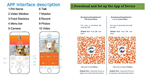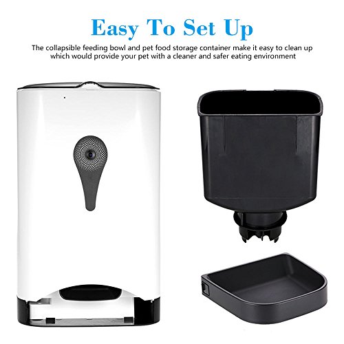 -. Feature : User friendly and easy to setup app: Simple to program the feeding schedule for your pet. Setup feeding intervals and control portion of each meal. Help control body weight and establish good eating habits which will allow them to live a long and healthy life with you. / Supports up to 32GB microSD card (not included). Operates on standard 2.4GHz Wi-Fi network. Powered by AC power adapter (included) or 3 D batteries (not included). / Smart Feeder, Smart Life -- Install PetFun app which is user-friendly and easy to set up, you can easily controll this smart feeder to feed your pet remotely, providing you convenience to you and feed your lovely pet in time and also, all you can controll all the functions of this pet feeder by the app, totally hand-free and smart! / EASY TO CLEAN UP -- The collapsible feeding bowl and pet food storage container make it easy to clean up which would provide your pet with a cleaner and safer eating environment / Only support 2.4GHz wifi network, please reset yout router to 2.4GHz if you are using a 5GHz wifi network and reset your mobile device's network. Compatible with IOS above 7.5 or Andriod above 4.0. So you could use it with your iphone/itouch/ipad or other smart devices.
