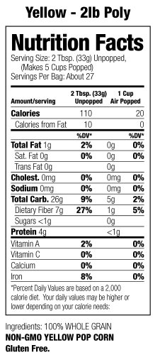 -. Binding : Grocery -. Brand : Jolly Time -. Feature : Case of 12 resealable poly bags. Each bag contains 2 pound of yellow kernels / Yellow popcorn kernels, grown and packaged in the USA / 100% whole grain; Non-GMO popcorn; Gluten free; High in fiber / Jolly time is America's first branded popcorn, and a 4th generation family-owned business since 1914 / Case of 12 reseal able poly bags. Each bag contains 2 pound of yellow kernels -. Label : Jolly Time -. Manufacturer : Jolly Time -. NumberOfItems : 12 -. PackageQuantity : 12 -. ProductGroup : Grocery -. ProductTypeName : GROCERY -. PublicationDate : 2014-01-30 -. Publisher : Jolly Time -. ReleaseDate : 2014-01-30 -. Studio : Jolly Time -. Title : Jolly Time Yellow Popcorn Kernels - Gluten Free Stovetop Popping Corn, 2 lb. Bags (Pack of 12)