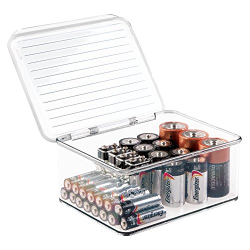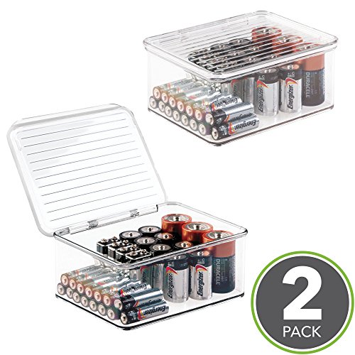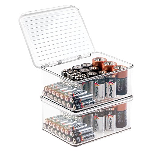 mDesign Stackable Battery Storage Organizer Box, Hinged Lid for AA, AAA, C, D, 9 Volt Sizes, Great Storage for Kitchens, Home Offices, and Utility Rooms - Pack of 2, Clear