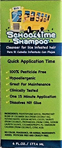Studio : BioSafe Technologies, Inc. Publisher : BioSafe Technologies, Inc. Binding : Health and Beauty Product Description Proven to be 100% Effective in Removing Lice and Nits. Pesticide and Enzyme Free. Fragrance Free. Patented Worldwide, Clinically Tested in 3 Countries. Quick Application Time. Tested Hypoallergenic. Schooltime Shampoo is Sold Domestically and in the Children's Line of Products in Major European Pharmacies. Tested to be Safe and Naturally Gentle to Skin and Eyes. It was Developed in Brazil by our Founder (also a schoolteacher and mom) after Witnessing the Effects from Overuse of Toxic Pesticide Products on Children in Efforts to Control Head Lice Infestations. She Tested the Effects from the Various Natural Oils and Plant Compounds from the Region in Combination with Natural Skin Care Ingredient Blends and Developed a Final Formulation Schooltime Shampoo. The Product is a Fragrance Free Easy to Apply Multi Use Formulation. A High Powered Shampoo Cleanser for Removing Lice and Nits Leaving Hair Clean, Shiny and Elegant Without Use of Pesticides, Silicones or Harsh Enzymes. Only Clinically Proven Lice Formulation to Soften and Dissolve the Nit Glue in the Hair for Easy Nit Removal During Final Rinse or Nit Combing. 0