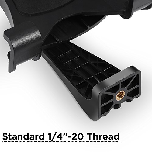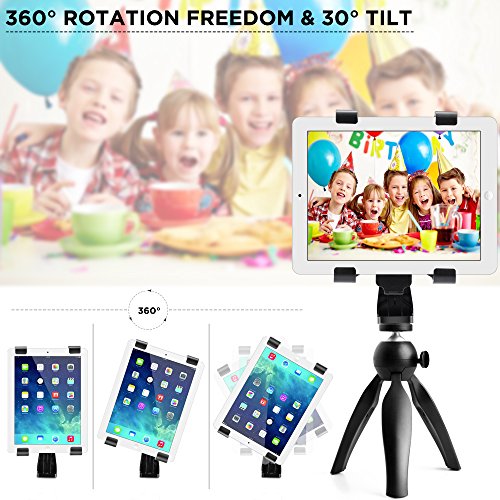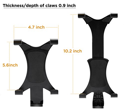 【Dimensions】Mount your tablet to a Tripod, Monopod, Selfie Stick, or any tripod with standard [1/4"-20 thread ]. Length [ 5.6 - 10.2 inch]. Width [4.7 inch]. Thickness/depth of claws [ 0.9 inch ]. Supports iPad mini/ 2/ 3/ 4/ Air/ Air2/, Samsung tab, Nexus,etc. Fits large phones that width is larger than 3 inch.