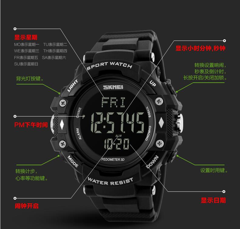 Special Features: Day of the Week, Countdown, Alarm, Calendar, Pedometer, Chronograph, Luminous, Month Display