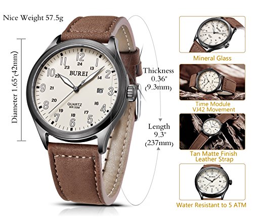 -. Feature : 1. Japanese quartz movement, date calendar analog display ❤ This model also comes available in BROWN face version version. ASIN: B01HBN8F5U ❤ / 2. Beige brass dial with arabic numbers, glow in the dark hours / 3. Round black stainless steel case with mineral glass dial window / 4. Soft tan matte finish leather strap with buckle closure, water resistant 5 ATM / 5. ★ WARRANTY: 30 Days money back guarantee; 12 months replacement or full refund for quality issues; 24 months maintenance for quality issues; ★ Package: 1x BUREI Watch, 1x Branded BUREI box, 1x Gift Bag, 1x Warranty Card, 1x User Manual.
