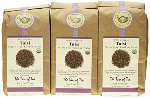 -. Binding : Grocery -. Brand : The Tao of Tea -. EAN : 0689951820464 -. Feature : Includes branches and stems of the plant, considered to be beneficial to ones health / Caffeine free / Tulsi contains antioxidants and is an adaptogen (helps improve resistance to stress and fatigue) -. Label : The Tao of Tea -. Manufacturer : The Tao of Tea -. NumberOfItems : 3 -. PackageQuantity : 3 -. ProductGroup : Grocery -. ProductTypeName : GROCERY -. PublicationDate : 2011-02-03 -. Publisher : The Tao of Tea -. Size : 8 Ounces -. Studio : The Tao of Tea -. Title : The Tao of Tea Purple Leaf Tulsi, 8-Ounce Bags (Pack of 3) -. UPC : 689951820464
