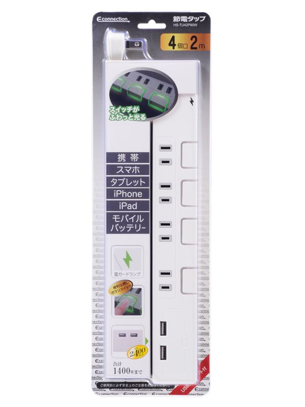 ●USB充電ポート2個(電流容量 合計2400mA)付き光る押しボタン式節電スイッチ 雷サージ軽減素子内蔵 耐トラッキングカバー付L型プラグ仕様