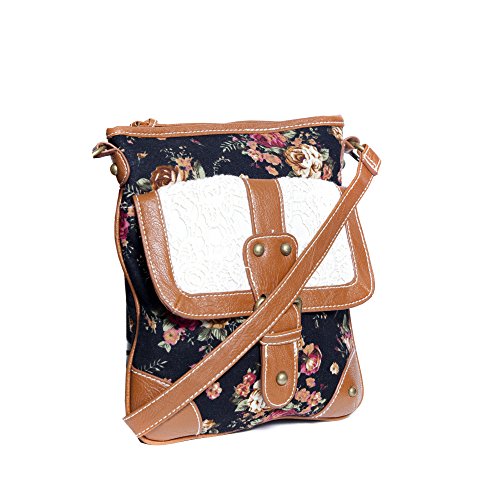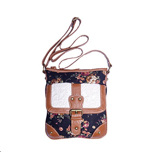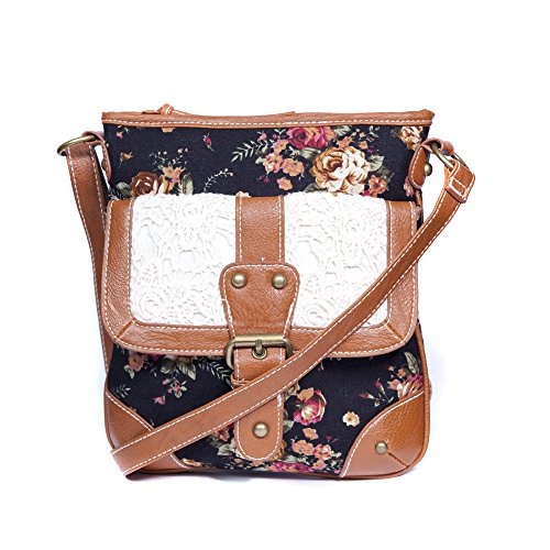 -. Brand : FLH -. Department : womens -. Feature : Vintage inspired blush roses P.R.Int on solid color background / Front exterior pocket features crochet flap with magnetic snap closure / Brown faux leather trim and shoulder strap - Strap adjustable up to a 26 inch drop / Interior features side zip pocket and 2 slip pockets, top zip closure / Overall measurement of bag: 11 in tall x 10 in wide (accommodates most small size tablets) -. PackageQuantity : 1 -. ProductGroup : Shoes -. ProductTypeName : HANDBAG -. Title : Vintage Floral Roses & Lace, Fabric Crossbody Messenger Purse w/ Front Pocket & Long Strap