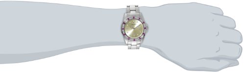 -. Feature : Row of Clear & Red baguette crystals along the bezel / Champagne dial with a date window at the 3 o'clock position / Silver-tone, stainless steel, case and bracelet / Swiss Quartz movement / Water-resistant to 30 M (99 feet) / Water resistant to 99 feet (30 M): withstands rain and splashes of water, but not showering or submersion
