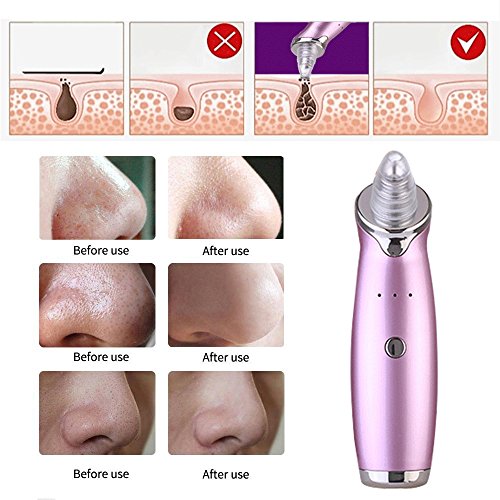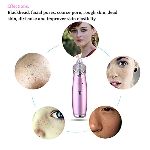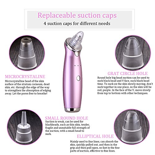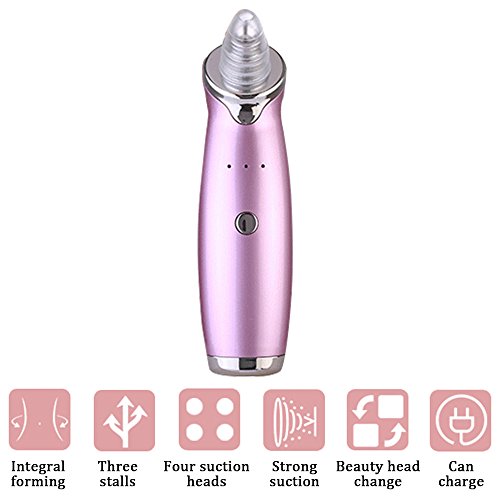 -. Feature : Multifunctional Cleaning Beauty Instrument --- Strong suction with Vacuum Extraction, Refine coarse pore, Exfoliate dead skin, Blackhead Acne Remover, reduce Grease, Dermabrasion, skin Rejuvenation. Effectively and deeply cleansing for different type of skin. / Refresh skin and improve skin absorption --- Our beauty device combined with Skin Care Products will help to restore cell activity, replenish nutrients and promote skin health. Suitable for all skin types, can be used on forehead, neck, cheeks and nose. / No harmful to Skin --- Safety and none-irritate, suitable for both sensitive and normal skin. After the skin care, due to accelerate the skin microcirculation, the skin will be a little excitement or red, this is a normal phenomenon, after the closure, 30 minutes will be automatically faded. Do not worry about it. / Head Replaceable Design --- 4 Detachable treatment heads are included, 3 working Intensity level (High, Medium and Low Grades )settings can be adjusted according to your beauty requirement. / Portable with USB Charging --- You can charge the pore cleanser machine anywhere with USB cable with LED indicator Via the computer, mobile device or any other device. What's more, it can be used in the home, office or outdoor whenever and wherever to provide you a comfort quiet facial cleaning environment and a great choose at home or in travel.