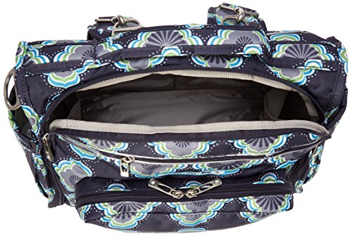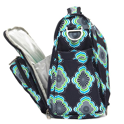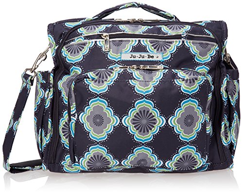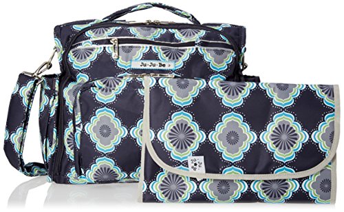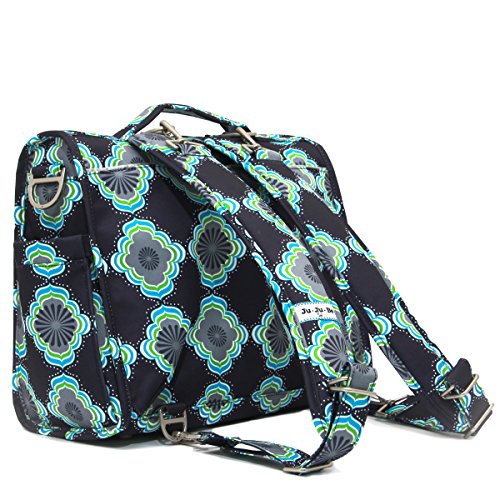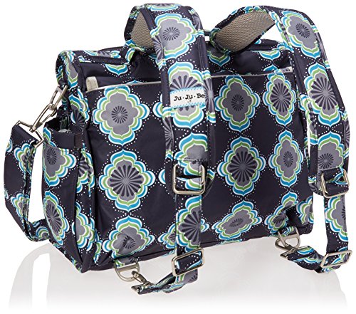 The Ju-Ju-Be B.F.F. Convertible Diaper Bag provides multiple carrying and storage options to help you stay ultra-organized. Just like your B.F.F., this machine washable backpack is something you cannot live without! Designed with convenience and comfort in mind, this versatile bag can be carried using its top handle, over-the-shoulder strap or backpack straps. The memory foam straps have textured fabric underneath to prevent the bag from slipping off your shoulder. Keep organized and sane, while never sacrificing looking good! The bag's lining is protected with Agion natural antimicrobial treatment, which inhibits and reduces the growth of odor-causing bacteria, mold and mildew. The outer fabric is treated with Teflon fabric protector, so you can repel stains and keep it clean. The front "mommy" zippered pocket is large enough for smartphones, wallets, keys attach to the key fob stretch cord, and other personal items. Inside organization includes (4) gusseted pockets, (3) zippered pockets and lots of wide open space! The main zippered pocket is large enough for diapers, wipes, extra clothes and other items. The back pocket is designed with crumb drains to keep this area clean, is large enough to store your child's books, and includs a super cushy matching memory foam changing pad. Bottle pockets are located on either side of the bag and come insulated with Thinsulate by 3M to keep your items hot or cold. The Moon Beam print is a blue, purple, green and white pattern with silver lining. The print is accented by silver colored hardware, including luggage feet to keep the bottom of your bag clean when you set it down. With the B.F.F. Diaper Bag, you can choose to wear it as a backpack or messenger style - it’s your choice. Whichever you choose, the B.F.F. has your back, just like every B.F.F. should! The Ju-Ju-Be B.F.F. Convertible Diaper Bag comes with a 90-day limited warranty that protects against manufacturing defects.Feature