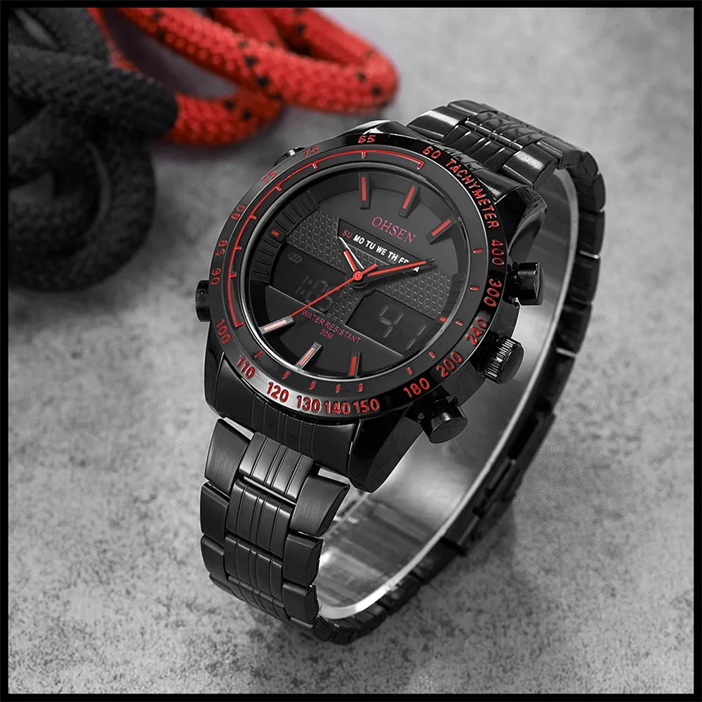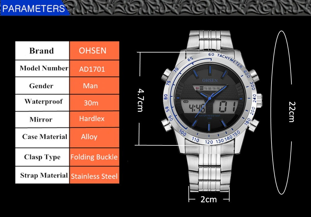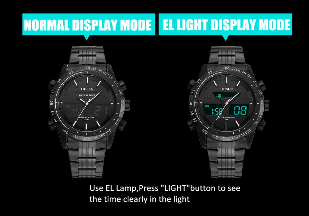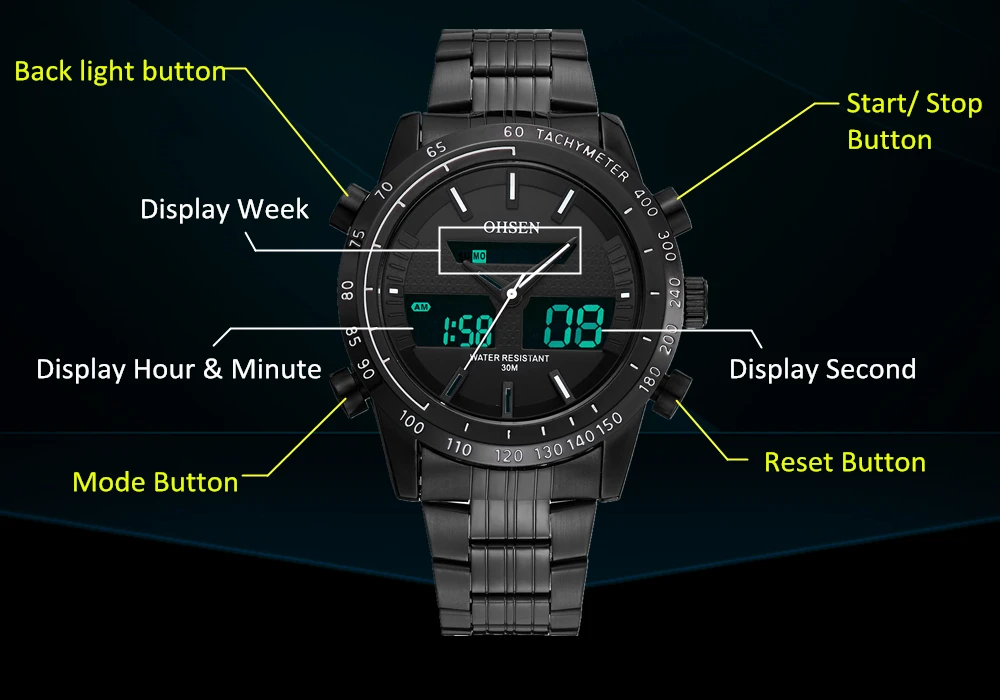 Feature:Alarm,Back Light,Water Resistant,Multiple Time Zone,Chronograph,Shock Resistant,Stop Watch,Swim,Auto Date,LED display